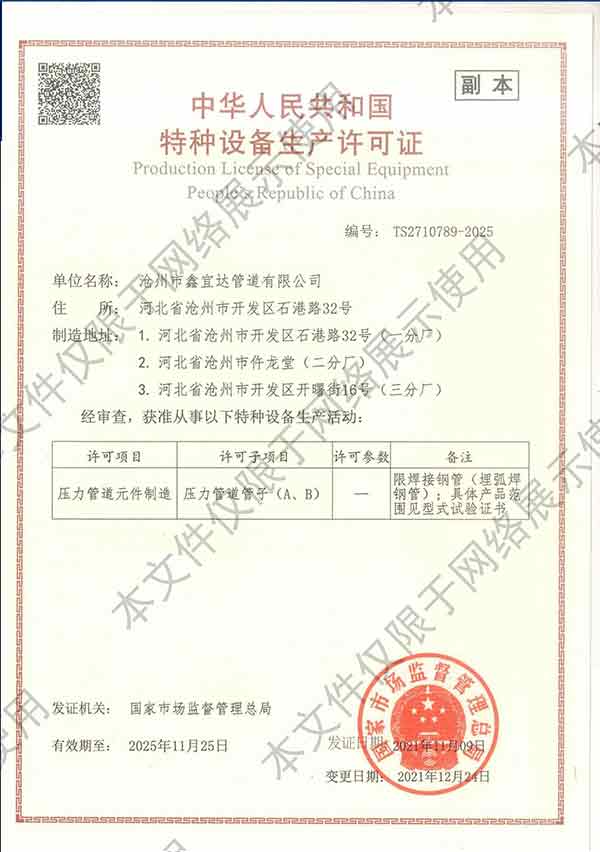 滄州市鑫宜達管道有限公司成立于2003年7月,坐落于滄州經(jīng)濟開發(fā)區(qū),占地面積40萬平方米,注冊資金1.81億元,是集螺旋鋼管生產(chǎn)、防腐加工以及無縫鋼管、卷板、帶鋼等品類鋼材經(jīng)營銷售于一體的工貿(mào)型企業(yè)。公司現(xiàn)有員工400多人,其中,中高級技術職稱的人員達120余名。 滄州市鑫宜達管道有限公司擁有9條螺旋鋼管生產(chǎn)線和3PE防腐生產(chǎn)線,可生產(chǎn)直徑219--3640mm,壁厚5.5--28mm,最高鋼級X100的各種規(guī)格防腐螺旋鋼管...